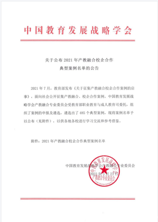 2021年7月,教育部发布《关于征集产教融合校企合作案例的启事》,面向社会公开征集产教融合、校企合作案例。中国教育发展战略学会产教融合专业委员会受教育部职业教育与成人教育司委托,组织了案例的申报及遴选。校领导对此高度重视,在科研与校企合作处组织统筹下,各二级学院积极申报,最终金融科技学院和电子商务学院所申报的案例成功入选。