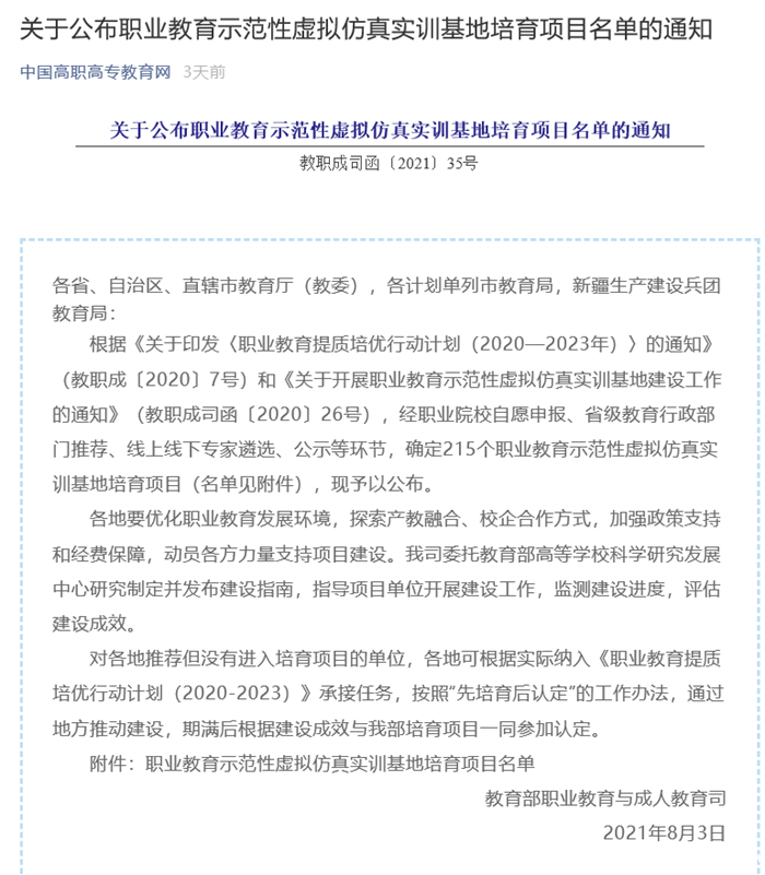 8月3日,教育部职业教育与成人教育司发布《关于公布职业教育示范性虚拟仿真实训基地培育项目名单的通知》,通知内容显示,我校“新零售虚拟仿真实训基地”入选职业教育示范性虚拟仿真实训基地培育项目名单。