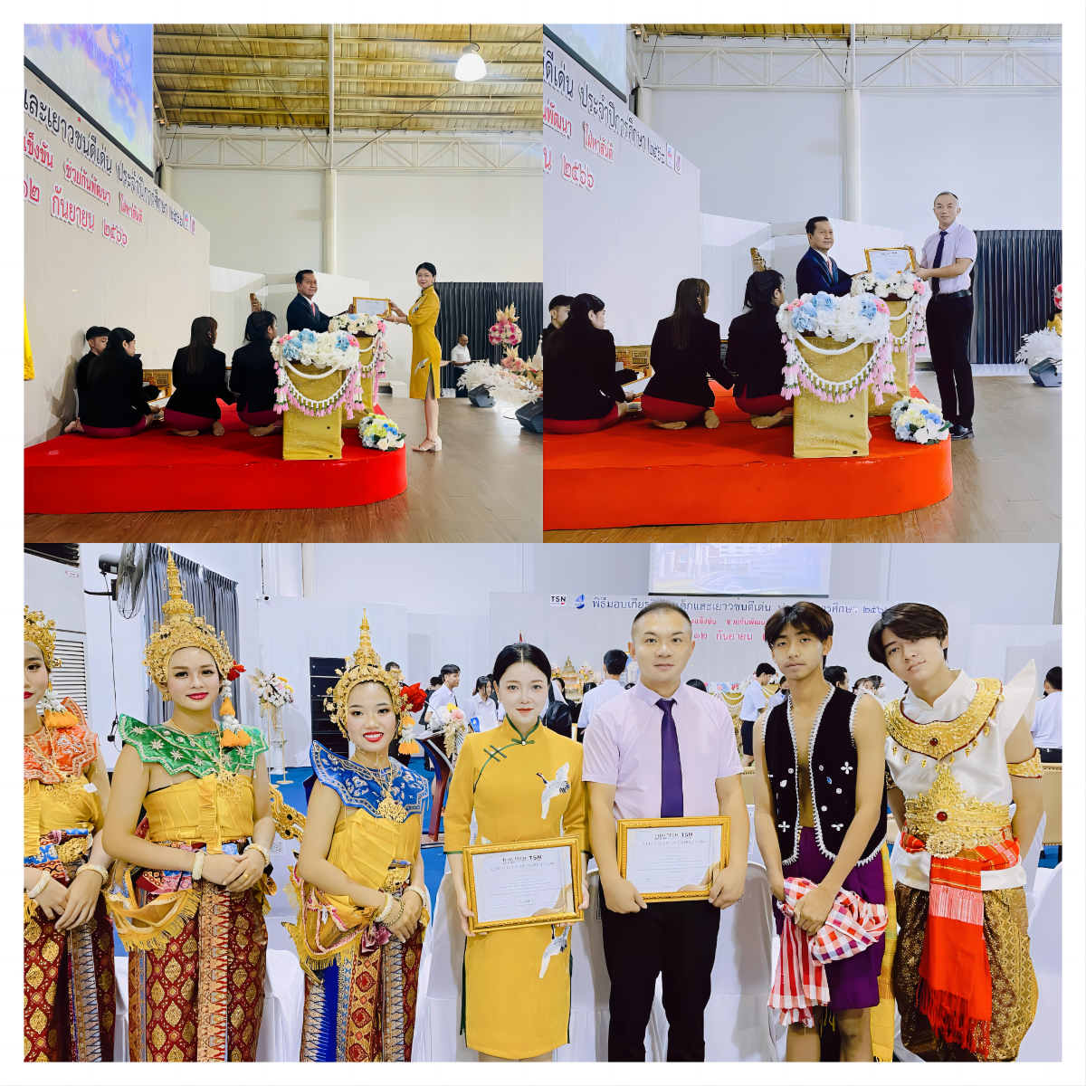 张磊、陈丹文两位老师甫一抵泰便受到了泰国教育部的表彰。泰国教育部基础教育委员会副秘书长帕塔纳(Mr. Pattana Pattanathaweedon)为两位老师颁发“中泰跨境教育、教学、管理和文化交流优秀中文教师”证书,表彰两位老师自2020年以来对泰开展的高质量教育教学工作,感谢学校对泰国塔克西纳商务管理技术学院和泰国大城商务管理技术学院汉语教学工作的支持。