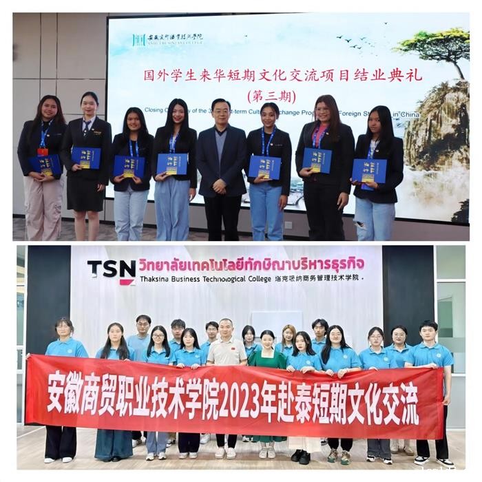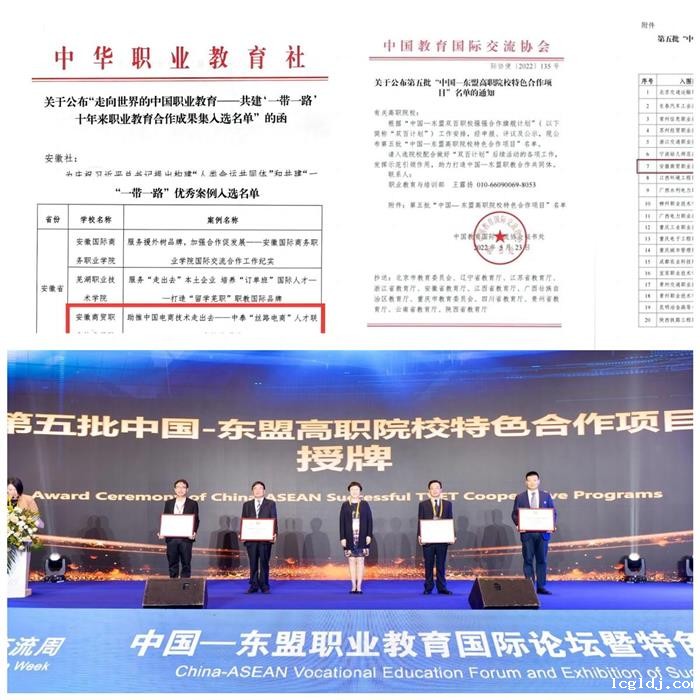 特色项目打造职教品牌。学校“中泰‘丝路电商’人才培养项目”入选“中国-东盟高职院校特色合作项目”,学校成为“中国-东盟职业教育联合会”正式成员单位,成为安徽省唯一入选高职院校。时任党委副书记、院长李忠应邀主持2022年中国-东盟职业教育国际论坛暨特色项目合作成果展第四场专题研讨并代表学校展示我校特色合作项目。学校案例“助推中国电商技术走出去——中泰‘丝路电商’人才联合培养项目”成功入选中华职教社“共建‘一带一路’十年来职业教育合作成果集”,并在2023“一带一路”职业教育国际论坛上予以发布。