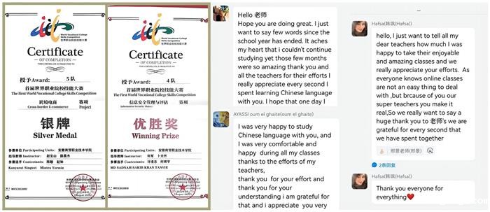 强化团队力量促发展。学校开展国际学生教学和管理团队建设,充实国际中文教育师资力量,组织28名教师参加国际教学能力培训,培养教学后备力量。开展两期国际交流能力提升培训,共110余名教师参加,提升教师双语授课能力和国际管理沟通能力。国际学生欧萨玛疫情后赴安徽工业大学继续求学,特意来学校感恩老师。国际学生韩飒通过我校汉语学习后成功入读长沙理工大学。3名国际学生参加的学生队在首届世界职业院校技能大赛中获银奖一项、优胜奖一项。