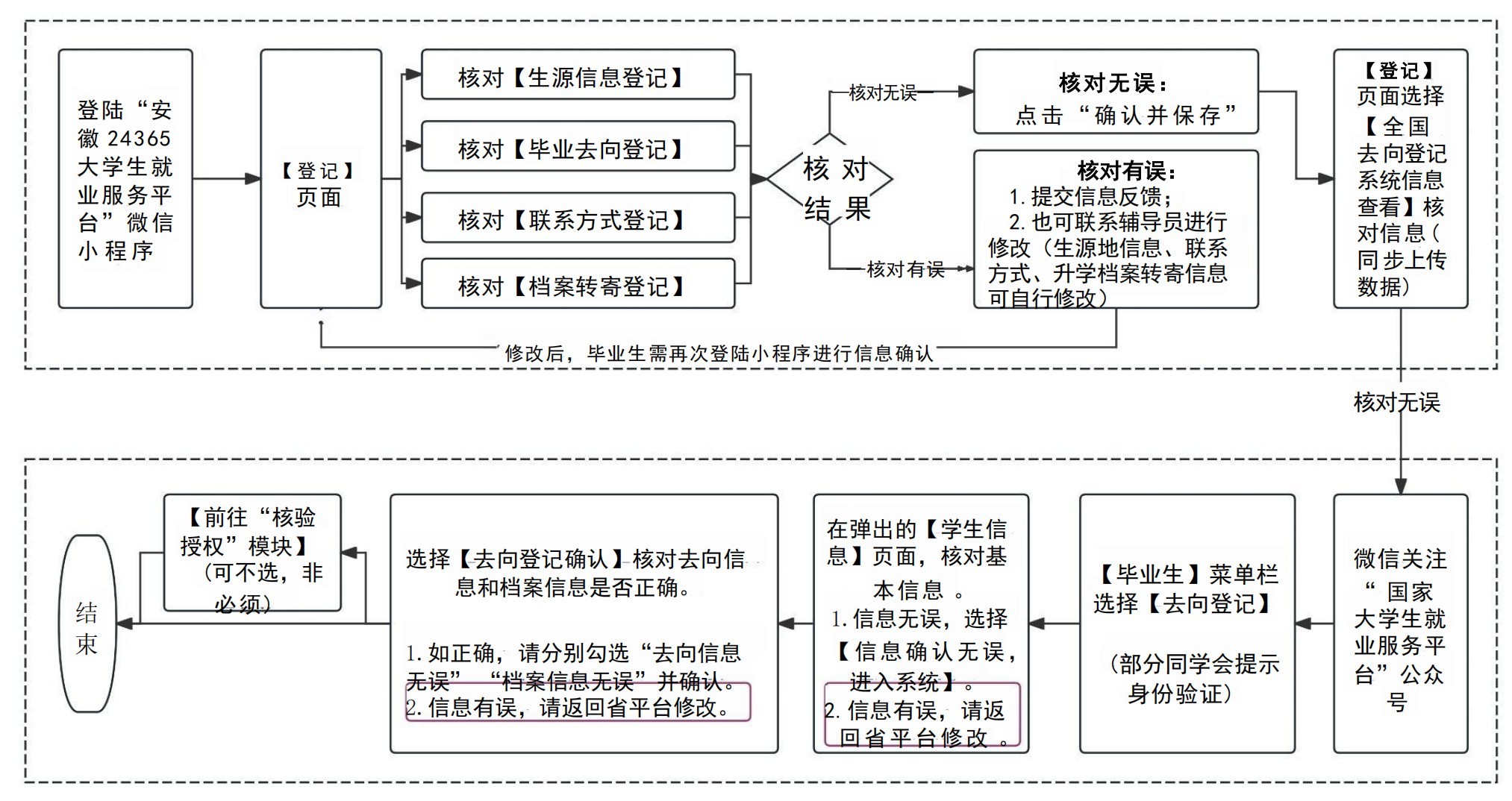(一)请各二级学院指导毕业生及时使用“安徽24365大学生就业服务平台”微信小程序自主登记个人毕业去向信息(登记-毕业去向登记),毕业生去向信息登记后有变更的,需在8月31日前及时进行更新。