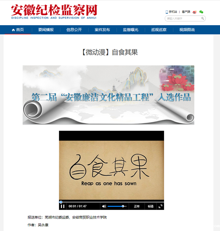 日前,安徽省纪委监委公布了第二届“安徽省廉洁文化精品工程”入选作品,在面向全省征集的广电、“三微”、平面、曲艺、书籍等五大类廉洁文化作品中,共1561件作品进入复评,经省纪委监委相关部门组织复评后,1116件作品进入终评。经过专家终评、会议研究、领导审定,最终确定490件作品作为第二届“安徽廉洁文化精品工程”入选作品,其中由我校艺术设计学院吴永康老师创作的微动漫《自食其果》成功入选。