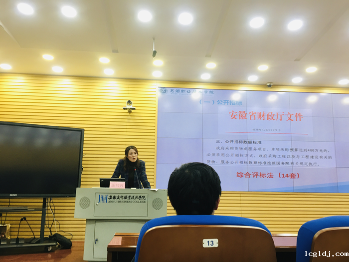 11月5日下午,为进一步加强电子商务专业群项目和任务负责人对招投标法律法规和政策文件的理解掌握,提升专业群建设项目招标管理水平和风险防范能力,电子商务学院邀请芜湖职业技术学院国有资产管理处招标投标办公室主任施吕蓉副教授来我校作《高校采购能力提升与风险防控》专题培训,校纪委副书记吴松飞、电子商务学院院长夏名首及“双高计划”电子商务专业群各项目及任务负责人参加了讲座活动,讲座由电子商务学院副院长段文忠主持。
