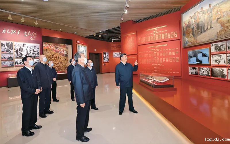 2022年10月27日,中共中央总书记、国家主席、中央军委主席习近平带领中共中央政治局常委李强、赵乐际、王沪宁、蔡奇、丁薛祥、李希,瞻仰延安革命纪念地。这是习近平等在延安革命纪念馆,参观《伟大历程——中共中央在延安十三年历史陈列》。 新华社记者 鞠鹏/摄