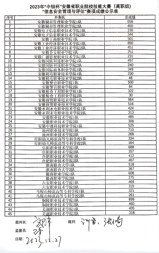 我院承办的2023年安徽省职业院校技能大赛信息安全管理与评估赛项于2023年12月27日结束,现将比赛成绩予以公示。
