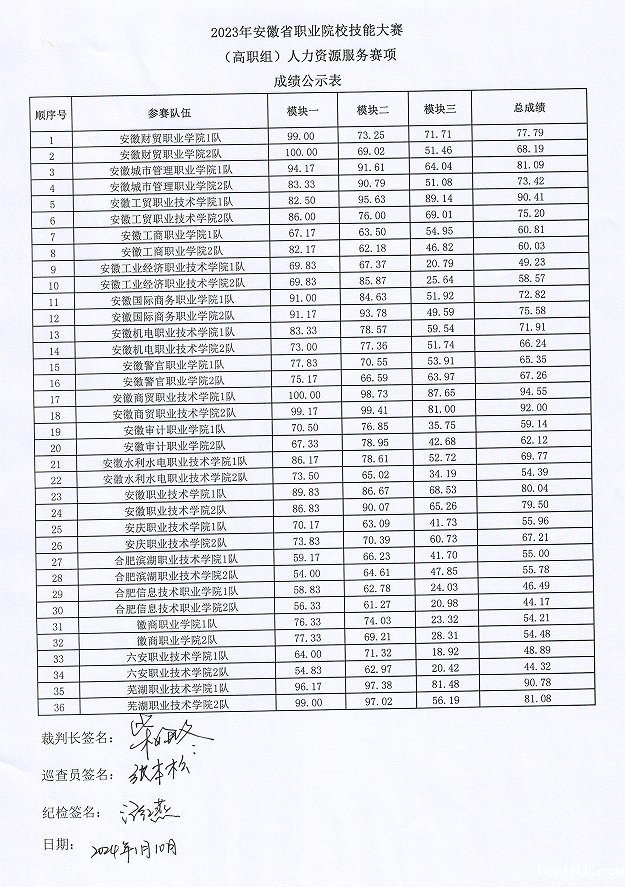 我院承办的2023年安徽省职业院校技能大赛(高职组)人力资源服务赛项于2024年1月10日结束,现将比赛成绩予以公示。