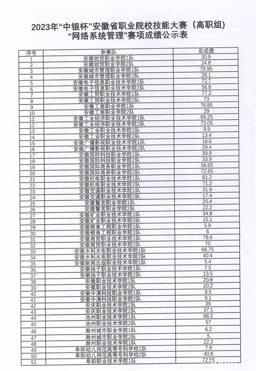 我院承办的2023年安徽省职业院校技能大赛(高职组)网络系统管理赛项于2024年1月16日结束,本赛项成绩公布后,接到成绩质疑,本着实事求是、高度负责的态度,裁判组重新对所有分项成绩进行复核了,发现存在统分有误,现已纠正,现重新发布成绩。