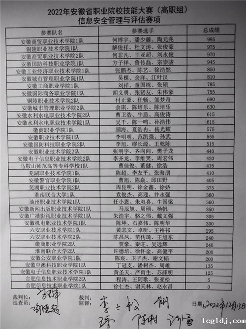 2022年安徽省职业院校技能大赛信息安全管理与评估赛项成绩公示