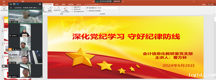 为深入学习贯彻习近平总书记关于党纪学习教育的重要讲话和指示精神,落实中共中央办公厅《关于在全党开展党纪学习教育的通知》文件要求,引导党员教师懂法纪、守底线,推动党纪学习教育深入开展,6与26日,会计学院会计信息化教研室党支部书记曹方林以《深化党纪学习,守好纪律防线》为题作线上专题党课报告,支部全体党员参加。