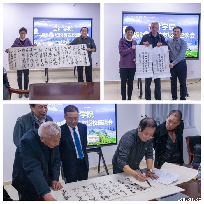 最后,校友王本才现场泼墨,并向学院赠送书法作品。校友吴昌福也向学院赠送了书法作品,表达对母校的感激之情。