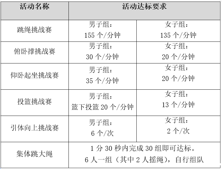 (一)线下——达人挑战赛。包括个人项目和集体项目共6项,每个项目设置“达标”和“达人”两个标准。完成既定标准即为达标,另设置单项冠军排行榜,通过更新排名的方式,激发挑战者的潜能,挖掘“运动达人”。