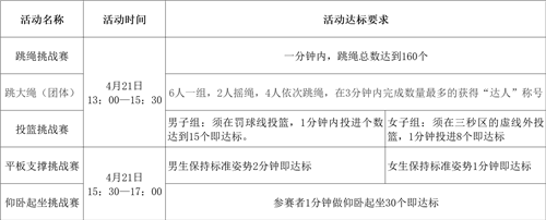 2.活动时间及地点:暂定4月21日下午13:00-17:00在篮球场举行,如因天气原因不能正常开展,则通过QQ群另行通知。