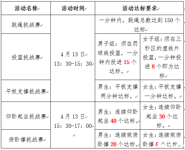 3.活动内容:包括跳绳、投篮、平板支撑、仰卧起坐、俯卧撑五个项目,每个项目设置“达标”和“达人”两个标准。完成难易适中的基本要求即为达标,另一方面设置排行榜,单项排名第一的同学获得“运动达人”荣誉称号。通过更新排名的方式,激发挑战者的潜能,挖掘运动达人,树立“三走”典型。