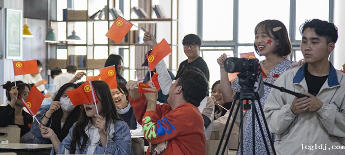 紧接着7位歌手相继登台,给大家带来了网红励志歌曲《少年》和吉他弹唱《奔跑》,熟悉的旋律感染了全场同学,大家都贴上脸贴,一起加入合唱。最后共青团团歌:《光荣啊!中国共青团》的旋律响起,全场同学手中的团旗飞舞,现场的气氛被彻底点燃。