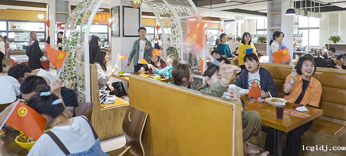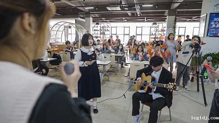 悠扬的音乐悄然响起,《十年》的歌声在食堂里回荡,或形色匆忙、或专心吃饭的同学都不约而同的转过了头,大家都被突然出现的歌声吸引,纷纷驻足,很多同学自发拿出手机,记录下这一难忘的瞬间。“十年转瞬,过眼烟云,十年之后,你我仍是青年”,现场的主持人的发言激起全场同学的共鸣,同学们将自己的青春岁月和共青团近百年的历史在歌声中交融起来。紧接着,一首《青苹果乐园》激情登场,4位歌手用充满激情的歌声和演绎,调动了全场同学的热情,也唱出了身逢盛世的一代青年的美好生活和精神风貌。