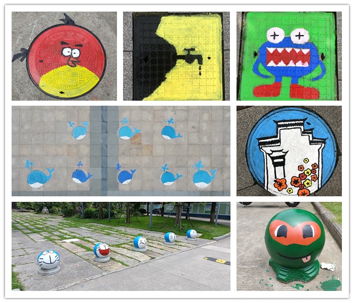 本次手绘包括徽商文化、动漫卡通、消防安全、预防诈骗、低碳环保等多个题材,绘制区域集中在环形机动车道、笃学楼、宿舍楼及食堂小广场,共绘制井盖柱墩100余个。经过志愿者们的一番改造,原本灰头土脸的井盖华丽变身,彩绘井盖给人带来了视觉上的警示,起到了艺术化提示“美与安全”的作用。校团委艺术团夏也清说:“学校开展井盖彩绘还是第一次,不仅让我们觉得很新鲜,也让学校井盖变得高大上起来!”一幅幅惟妙惟肖的井盖画,吸引了大朋友小朋友们驻足观看、拍照转发。一位同学的朋友圈写到:“天天踩过毫不起眼的井盖也可以成为我们大商贸的一道亮丽风景线,以前在网络才能看到的井盖艺术,现在自己‘家里’就有,给志愿者们点赞!”