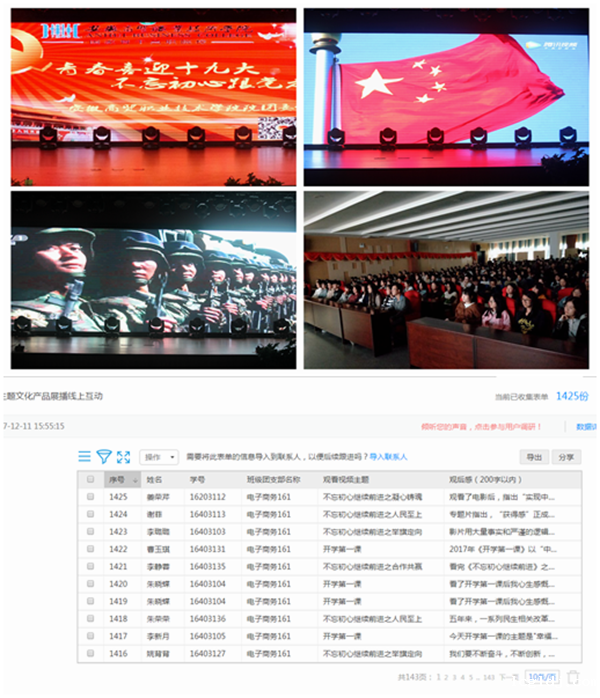 “十九大”召开前期,校团委组织团员青年观看“三下乡”社会实践活动总结汇报会;组织各班级团支部轮流观看“喜迎十九大”相关主题文化产品;党的十九大召开期间, 专门组织收听收看十九大会议报道等活动。活动结束后,同学们纷纷通过校团委微信公众号参与互动,陆续发布观后感1400多条。通过活动教育引导广大团员坚定理想信念,积极践行社会主义核心价值观,在决胜全面建成小康社会进程中充分发挥生力军和突击队作用。