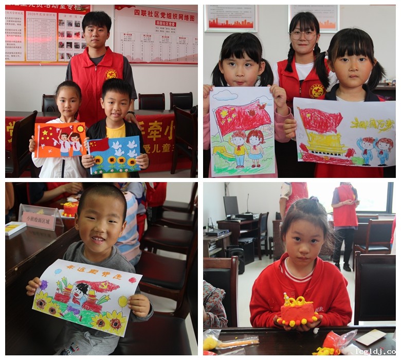 小朋友们在志愿者的带领下,发挥奇思妙想,制作出一件件充满童趣和创意的作品,有用粘土制作的版画《天安门》,有用彩笔描绘的《同心向党》、《阳光下成长》等,还有小朋友用粘土制作成蛋糕,庆祝中国共产党成立100周年。小朋友们手捧着作品,洋溢着自豪与快乐的笑容,并和志愿者们一起兴致勃勃的拍照留念。最后,志愿者和社区工作人员一起向小朋友们赠送六一儿童节礼物。活动在欢声笑语中圆满结束。