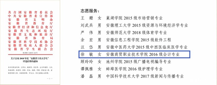 日前,共青团安徽省委、省委宣传部、省文明办、省教育厅等11家单位联合印发了《关于公布2018年度“安徽省十佳大学生”评选结果的通知》,我校会计系会计161班徐敏同学荣获“安徽省优秀大学生”荣誉称号。同时,在省委教育工委组织的2018年度安徽省大学生年度人物评选工作中,徐敏获得“2018年度安徽省大学生年度人物提名奖”称号。这是我校学子首次同时获得两项殊荣。