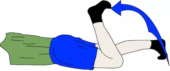 操作:弯曲你受伤的膝盖,尽量使你的脚跟尽可能接近你的屁股。保持膝盖在这个位置5到10秒,然后去开始位置,放松。