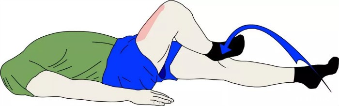 操作:弯曲你的膝盖,用你的右脚跟触摸左膝盖。在此位置,您可以将膝盖向外倾斜,然后慢慢返回到起始位置。