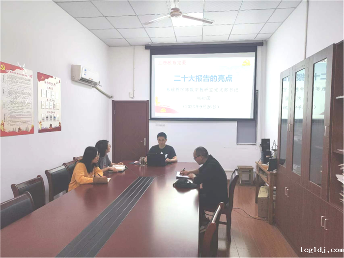 为进一步学习党的二十大精神,深入贯彻习近平新时代中国特色社会主义思想主题教育走深走实,9月26日,基础教学部数学教研室党支部书记刘知国以《二十大报告的亮点》为题讲授专题党课,支部全体党员参加学习。