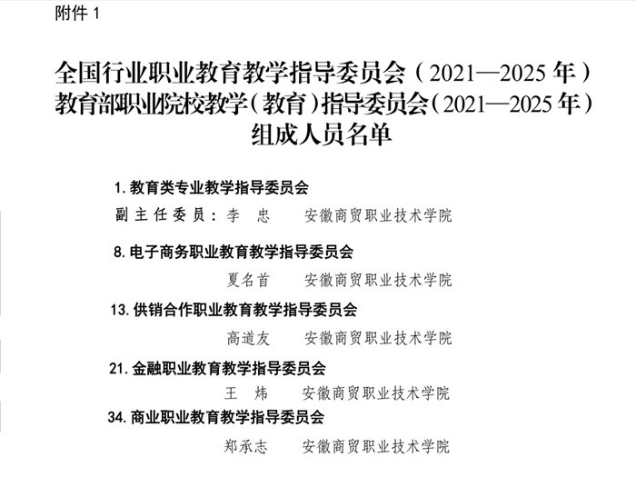 新一届全国行业职业教育教学指导委员会(2021—2025 年)由57个行指委组成,新一届教育部职业院校教学(教育)指导委员会(2021—2025 年)由5个教指委组成。我校李忠、郑承志、王炜、高道友、夏名首当选新一届委员。