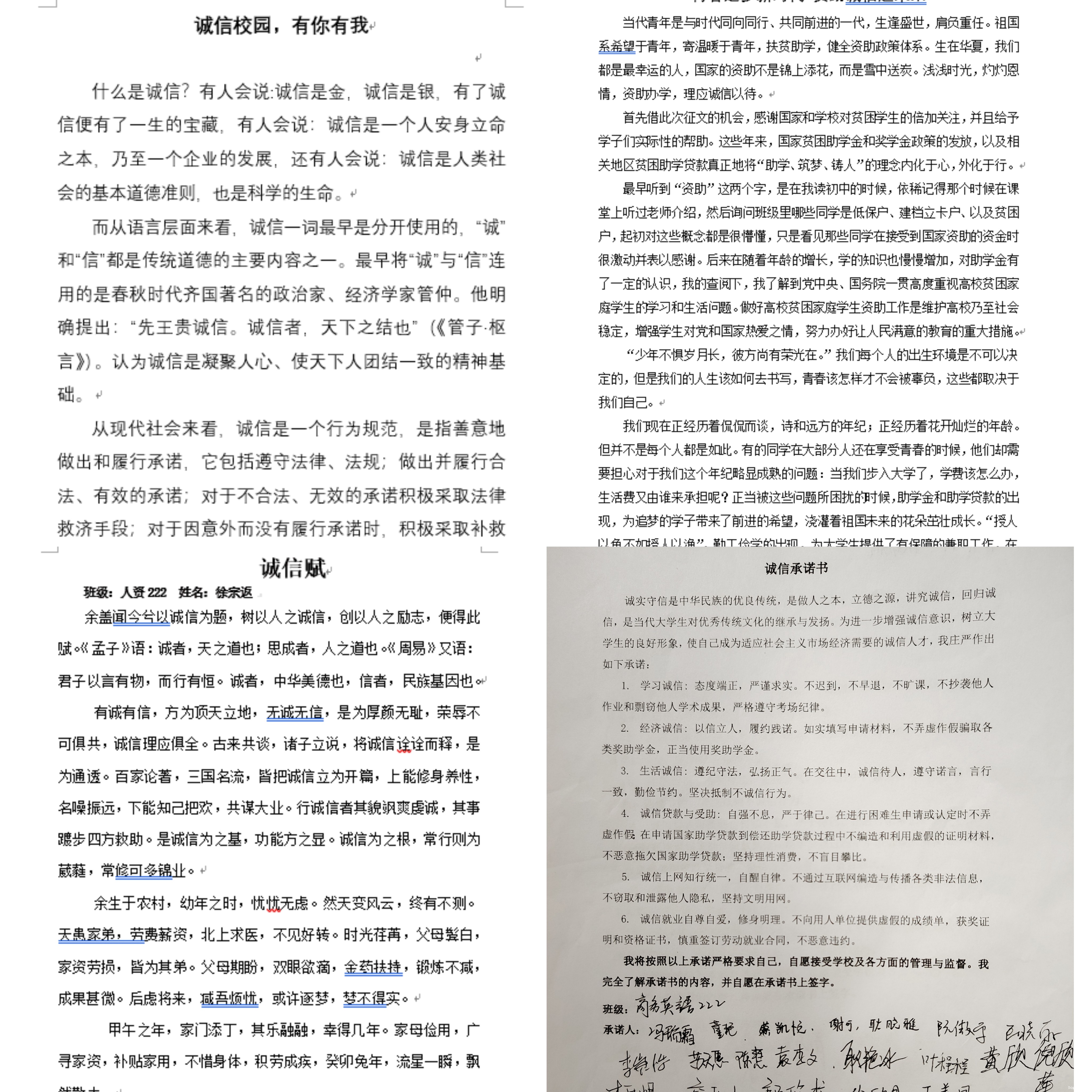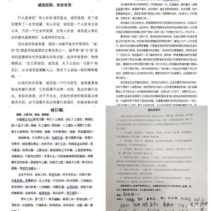 为深化资助诚信育人内涵,彰显育人特色,强化活动效果,学院通过主题征文、共签承诺书、我来讲诚信等系列活动,强化学生对诚信的认识和理解,让同学们充分认识到诚实守信与实现自身价值的密切关系,牢固树立诚信为本、操守为重、守信光荣、失信可耻的信用意识和道德观念。同学们纷纷表示会时刻严格要求自己,树立个人诚信形象,坚持诚信处事原则,端正诚信求知态度,弘扬明礼诚信的光荣传统。