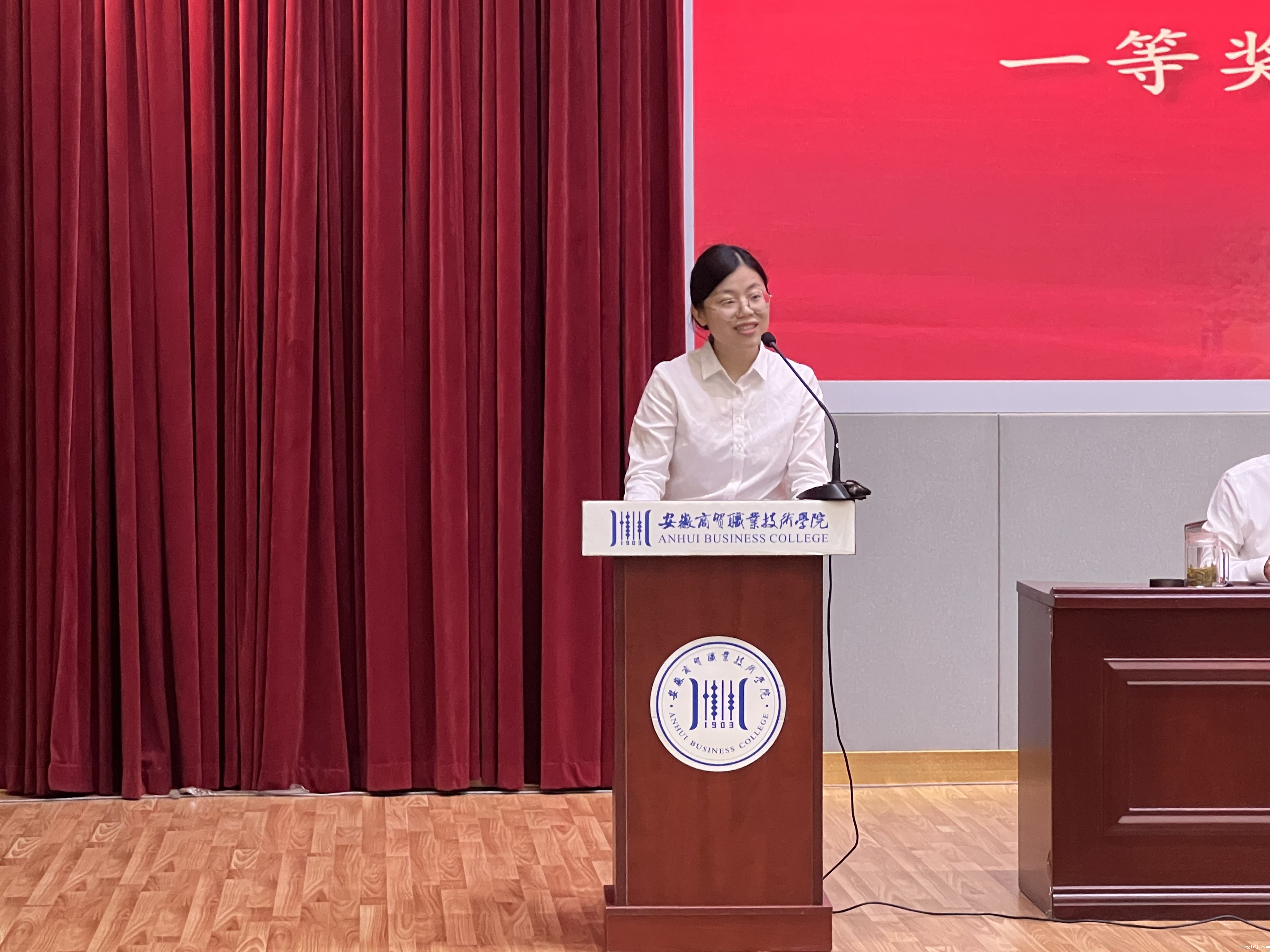 2024年安徽省高等职业院校教学能力大赛一等奖获得者、学院酒店管理教研室老师蒲白翎,作为教师代表进行发言,语重心长、谆谆教诲,引导同学们务必珍惜大学时光、坚持培养良好习惯、认真做好学业规划、积极参加专业实践,通过自身努力实现梦想。