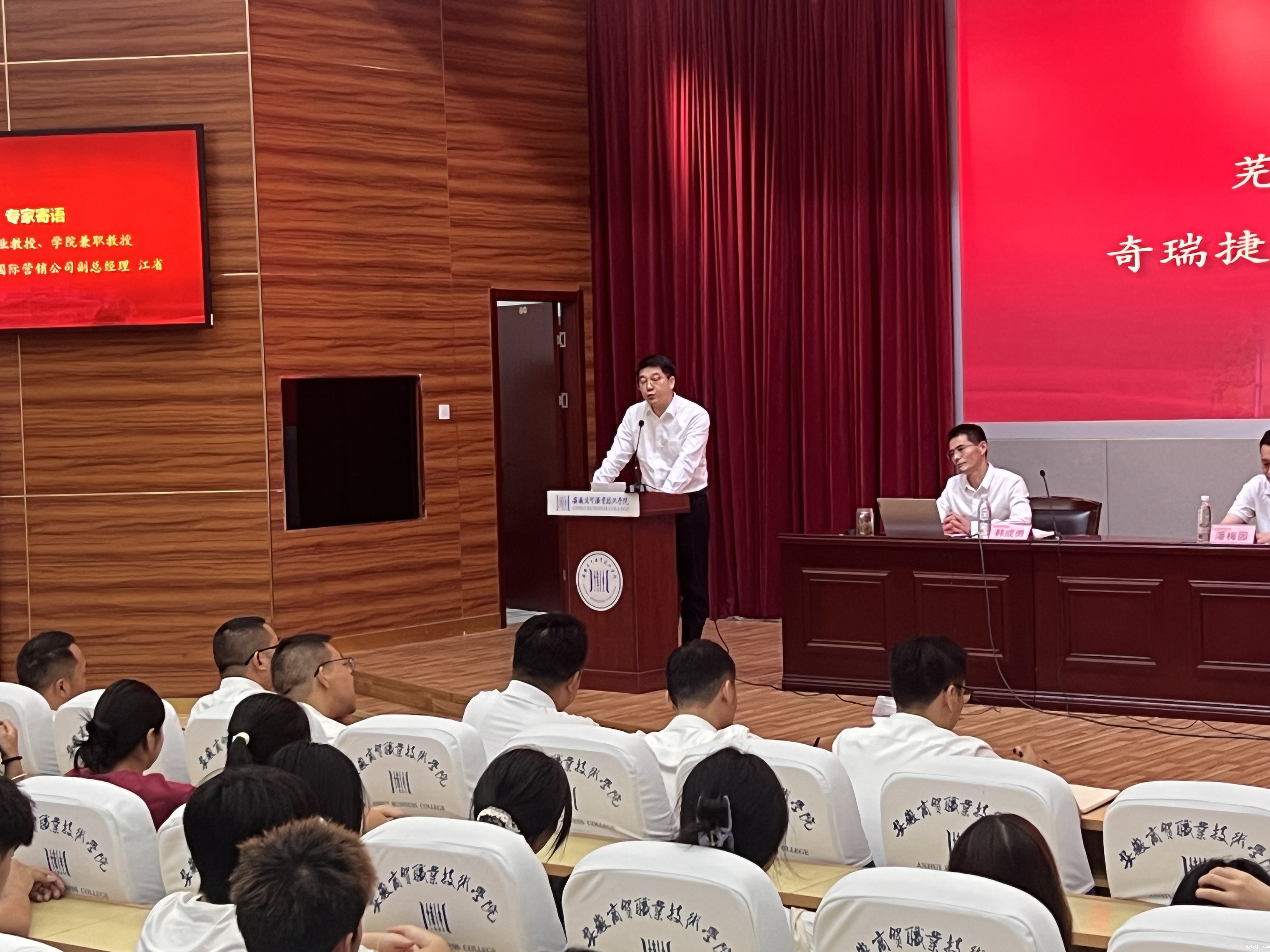 芜湖市产业教授、学院兼职教授、奇瑞捷途汽车国际营销公司副总经理江省、学院2004届旅游管理专业校友、芜湖新百金陵大酒店人力资源经理潘梅园先后发言,寄语新同学,他们结合自身的工作和发展历程,勉励同学们努力学习、拥抱未来、大胆探索、迎接挑战,让同学们对未来充满了无限的憧憬和期待。
