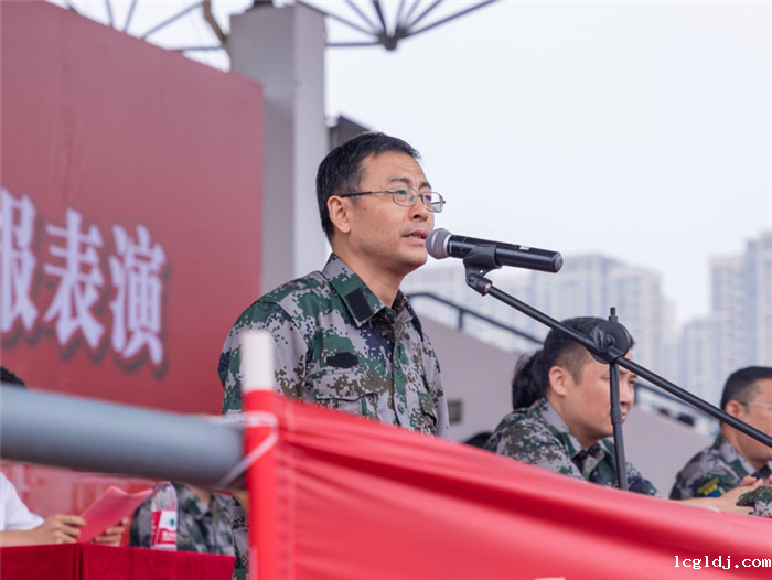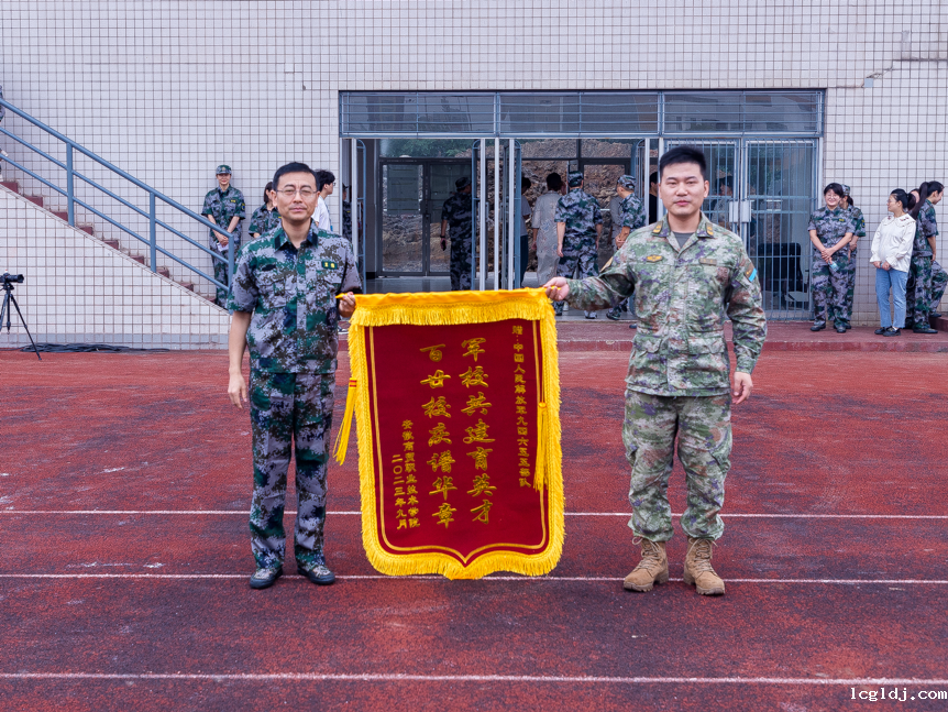 王炜代表学校向94655部队赠送锦旗,感谢94655部队多年来对我校军训工作给予的大力支持和无私帮助,并宣布分列式汇报表演正式开始。