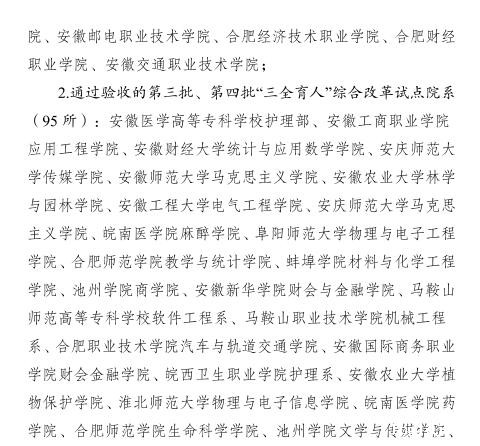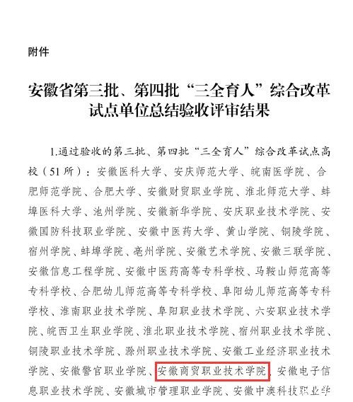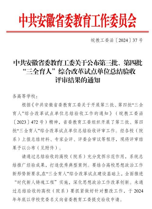 近日,省委教育工委发布《中共安徽省委教育工委关于公布第三批、第四批“三全育人”综合改革试点单位总结验收评审结果的通知》,我校作为安徽省第四批“三全育人”综合改革试点高校,电子商务学院、国旅商务与旅游学院作为第四批试点院系,均顺利通过总结验收。