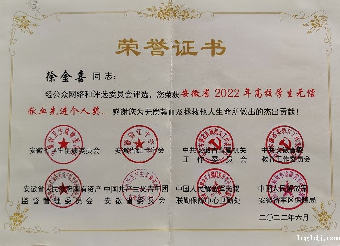 近日,由芜湖市公民献血领导小组、芜湖市卫生健康委、芜湖市红十字会联合主办,芜湖市中心血站、芜湖传媒集团承办的“芜湖市2019-2021年度无偿献血颁奖活动”圆满落下帷幕,我校喜获“芜湖市2019-2021年度无偿献血先进集体”称号,我校学生徐金喜荣获“安徽省2022年高校学生无偿献血先进个人”称号。