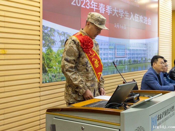 欢送会上,孙握瑜介绍我校2023年春季入伍情况并宣读春季入伍大学生名单和入伍去向。电子商务学院连锁经营管理201班庄执政同学代表全体应征入伍大学生发言,他表达了对即将奔赴军营的激动心情,表示会坚定报国理想,牢记校训,展现商贸学子良好的精神风貌,把吃苦在前,甘愿奉献的思想牢牢扎根,不辜负祖国和母校的期望。