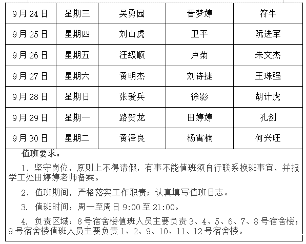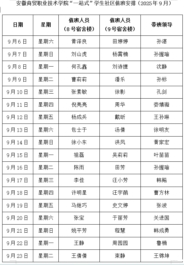 2025年9月“一站式”学生社区值班安排