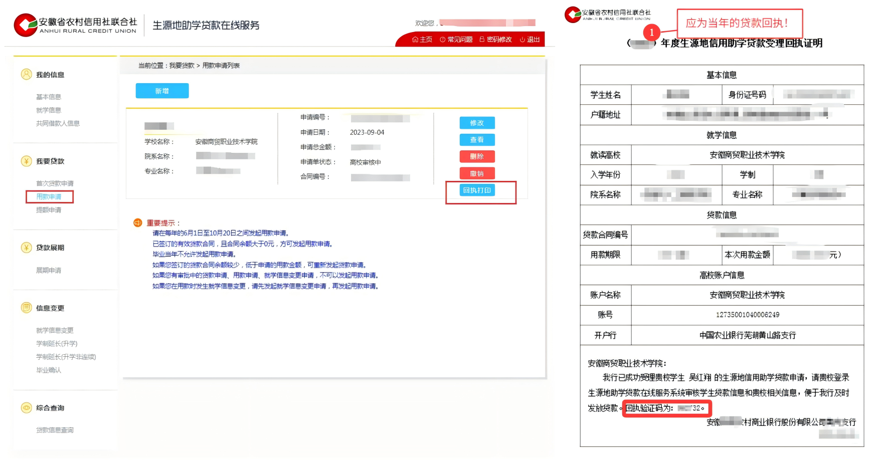 3.请注意区分贷款机构养成定期登录系统的习惯,保存好登录密码。登录在线系统,下载、截图或打印当年贷款回执单(用款回执/受理证明上有6位贷款回执码),通过今日校园APP(新生通过【绿色通道】模块,老生通过【辅导猫】)录入贷款回执信息(登记6位贷款回执码,上传贷款回执图片),后续由学校学生资助管理中心统一录入电子回执,完成学校审批。因学生未提交当年贷款回执码,导致高校未按时录入回执的,视同借款学生撤销当年生源地信用助学贷款申请。