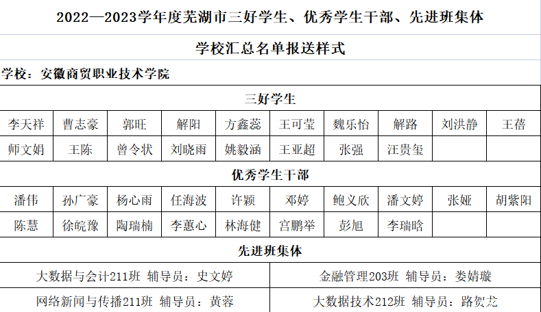 关于2022/2023学年度芜湖市三好学生、优秀学生干部、先进班集体的公示