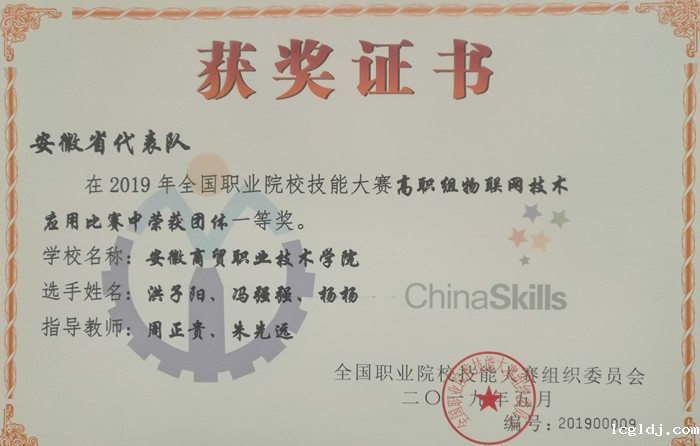 5月7日,2019年全国职业院校技能大赛高职组“物联网技术应用”赛项在天津中德应用技术大学开赛。来自全国各省、市、自治区的104支参赛队,300余名选手同场竞技。经过激烈角逐,由我校电子信息工程系洪子阳、杨杨、冯强强三位同学组成的代表队凭借扎实的专业技能,最终斩获一等奖,指导老师周正贵、朱先远获“优秀指导教师”称号。
