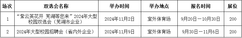 参加线下招聘会的用人单位实行校招服务平台网上预约制,未经预约或预约申请审核未通过的用人单位不予入校。场次1(11月2日)限定芜湖市区域内企业参加,场次2(11月9日)省内外企业均可报名参加。